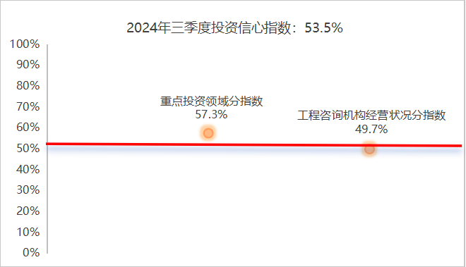 2024年三季度投资信心指数为53.5%,较二季度上升1%,投资信心向好。投资信心指数由重点投资领域分指数和工程咨询机构经营状况分指数构成,其中重点投资领域分指数对投资信心指数支撑作用明显。